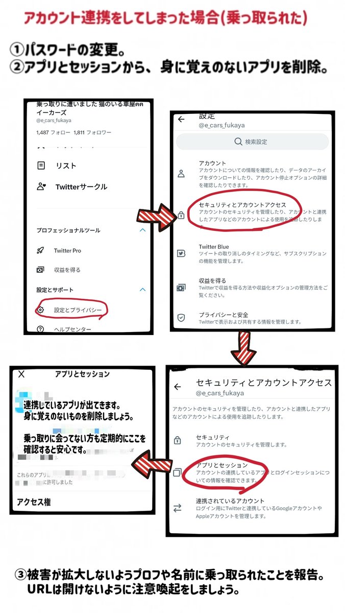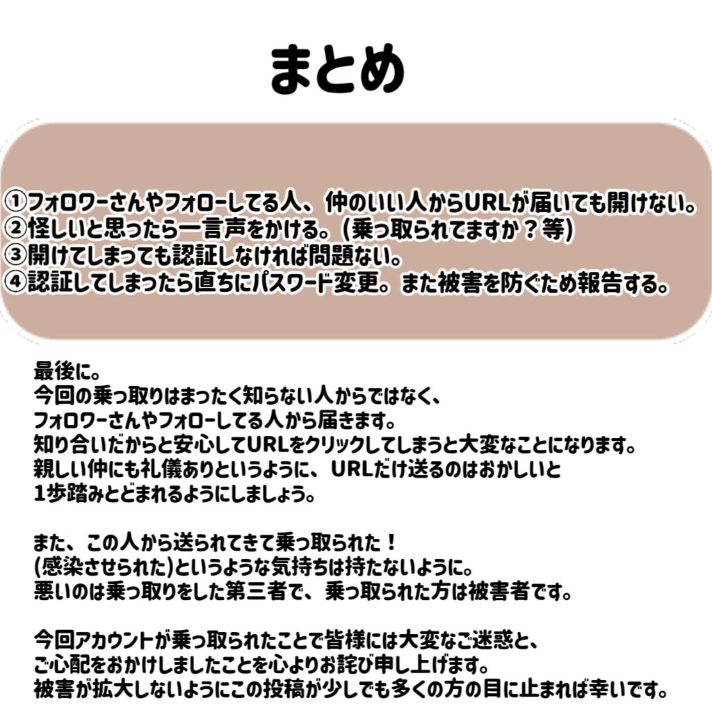 ⚠️注意喚起⚠️ 昨年からTwitter乗っ取り被害が多くあるようです。 これ以上被害が拡大しないようにまとめました。 長い文章で読みにくいかと思いますがどうか1度確認をお願いいたします。