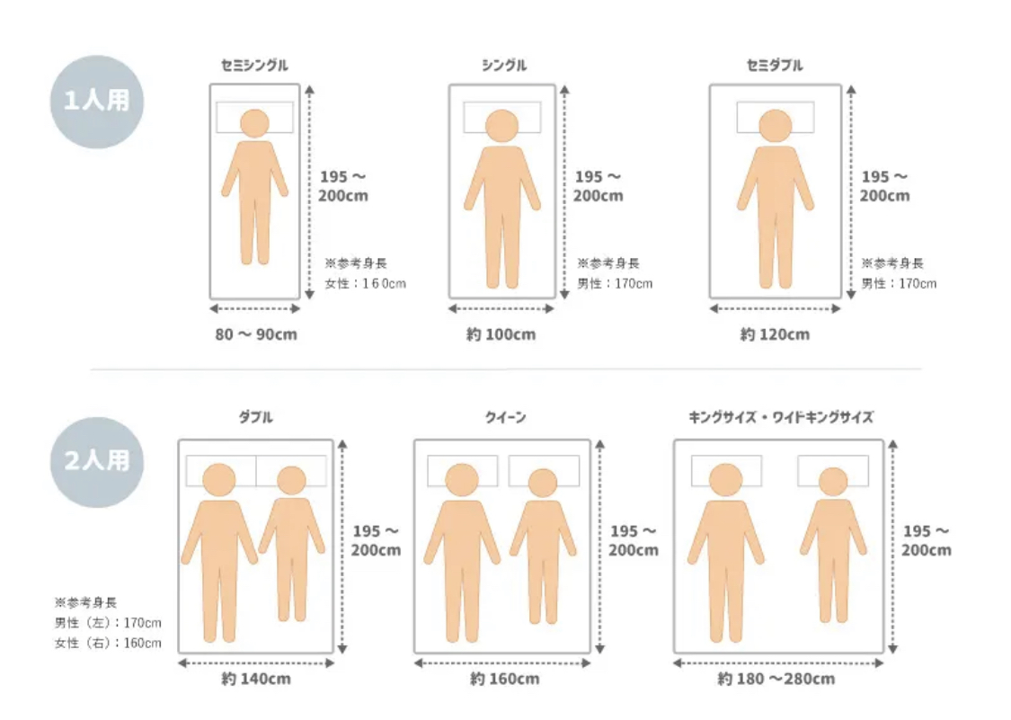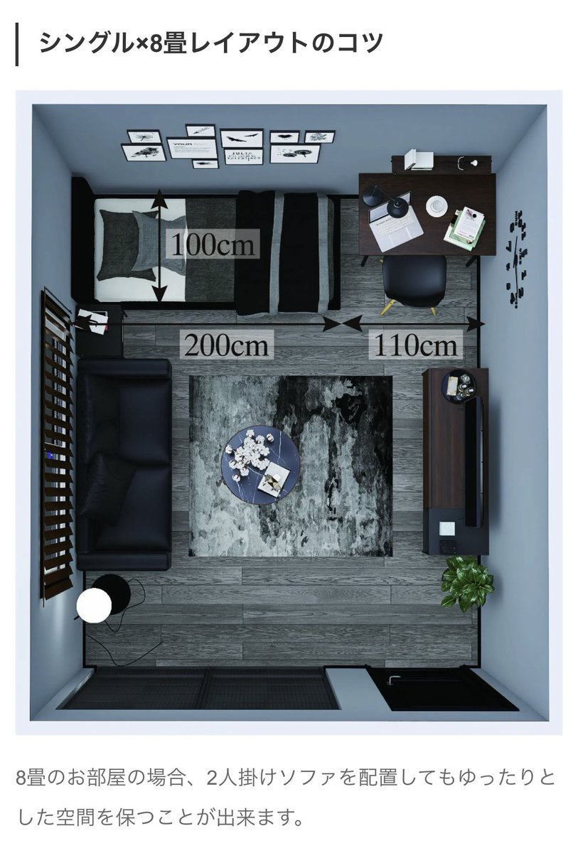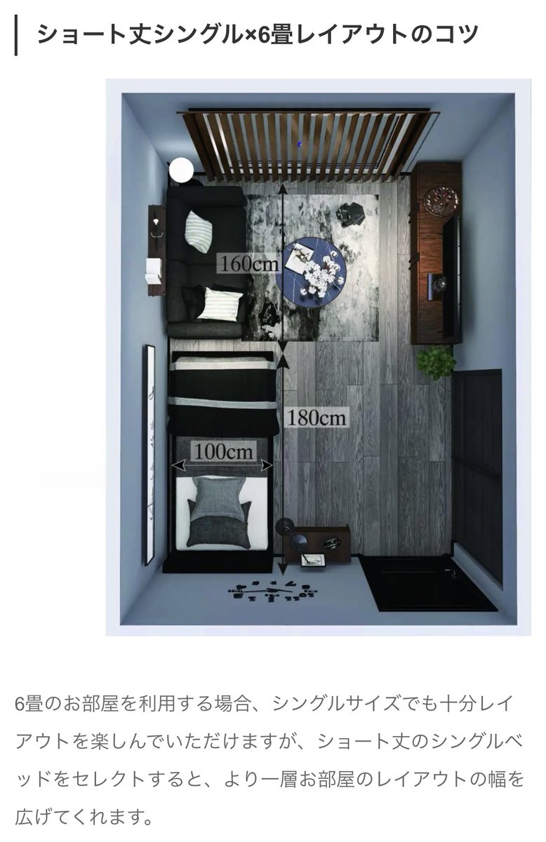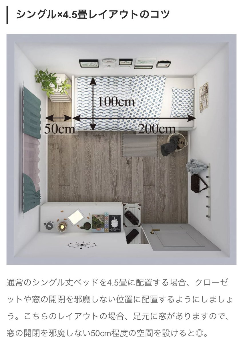 ↑一人暮らしの場合は横90〜100cm×縦200cm(シングルサイズ)を選ぶ人が多いので、初めて一人暮らしする予定の人は参考にしてみて。ちなみにシングルベッド置いた部屋のレイアウトはこんな感じ↓画像の引用元サイト(bedstyle.jp/media/choose/ベッドのきほん/3230#i)