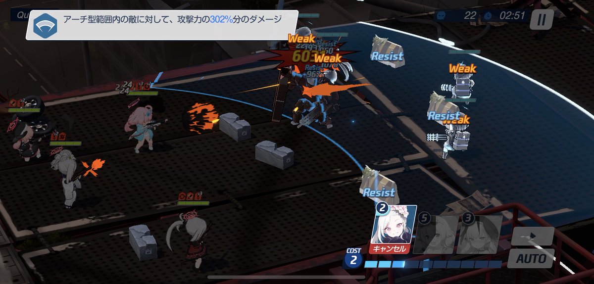 1:水コなどでクロコの広範囲スキルを順に左→中央→右に移動させる