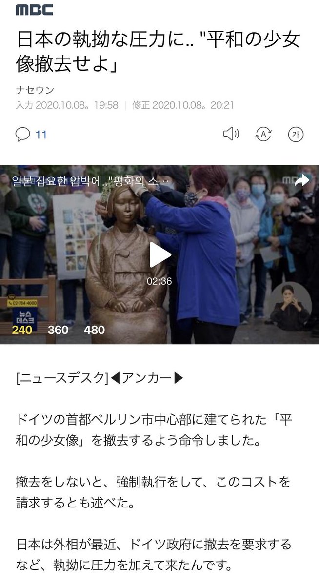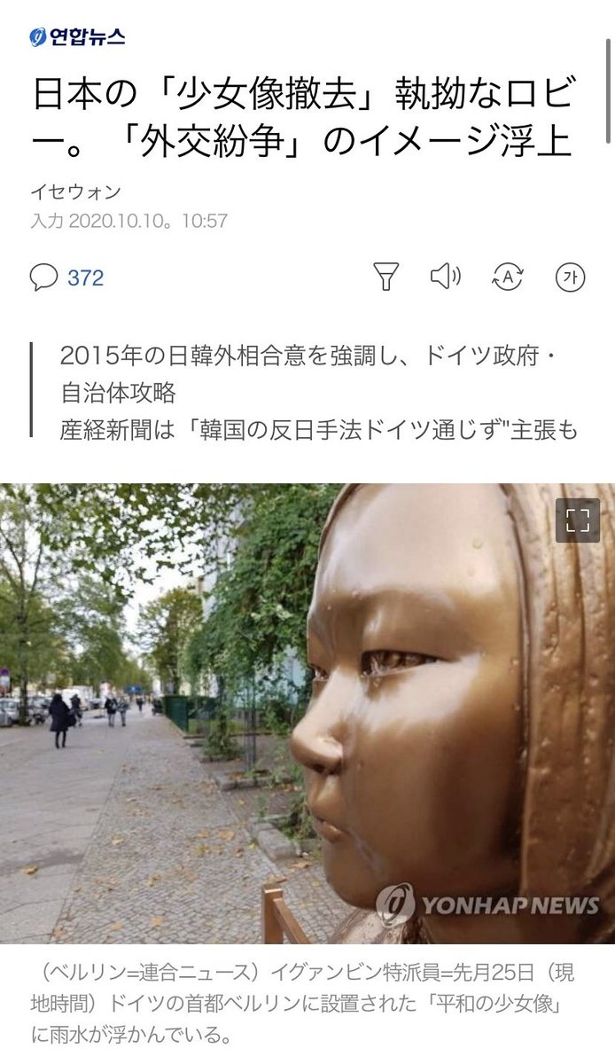 ベルリンの慰安婦像について、ベルリン州のスポークスマンは「日本大使館・市当局と問題解決のために邁進している」と明かした。詳細はまだ不明。この動きで不利と感じたのか、韓国側は脅しと妨害を止めるよう、日本に声明を出した。