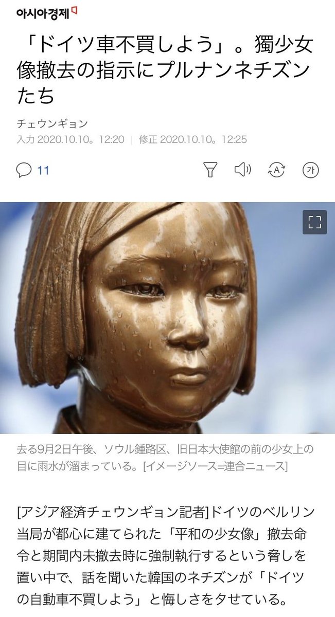 ベルリンの慰安婦像に撤去命令が出され、設置を主導したコリア協議会は「表現の自由の圧迫」として、訴訟を起こす意向。韓国政府も支援を検討している。韓国内ではドイツに失望の声が上がり、ドイツ車不買運動の呼び掛けが始まった。