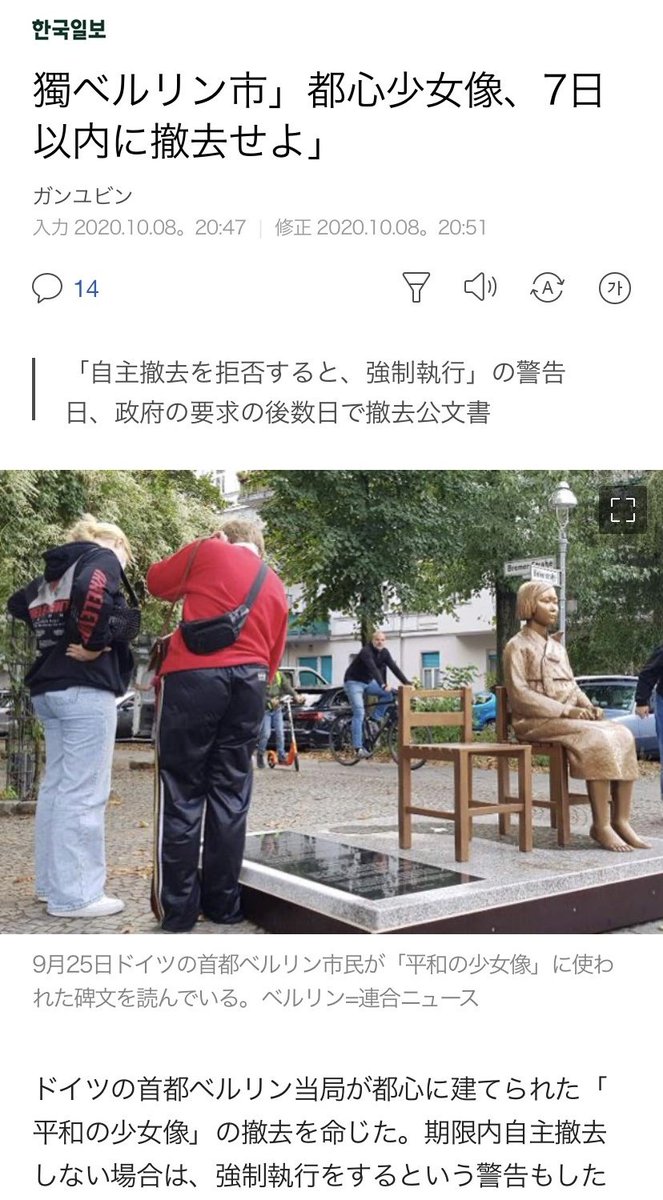 ベルリン当局は、韓国市民団体が建てた慰安婦像の撤去を命じた。撤去は7日以内。従わなければ強制執行される。撤去理由は「事前通知なく日本を攻撃する碑文を設置し、日独関係の危機を生んだ」とのこと。