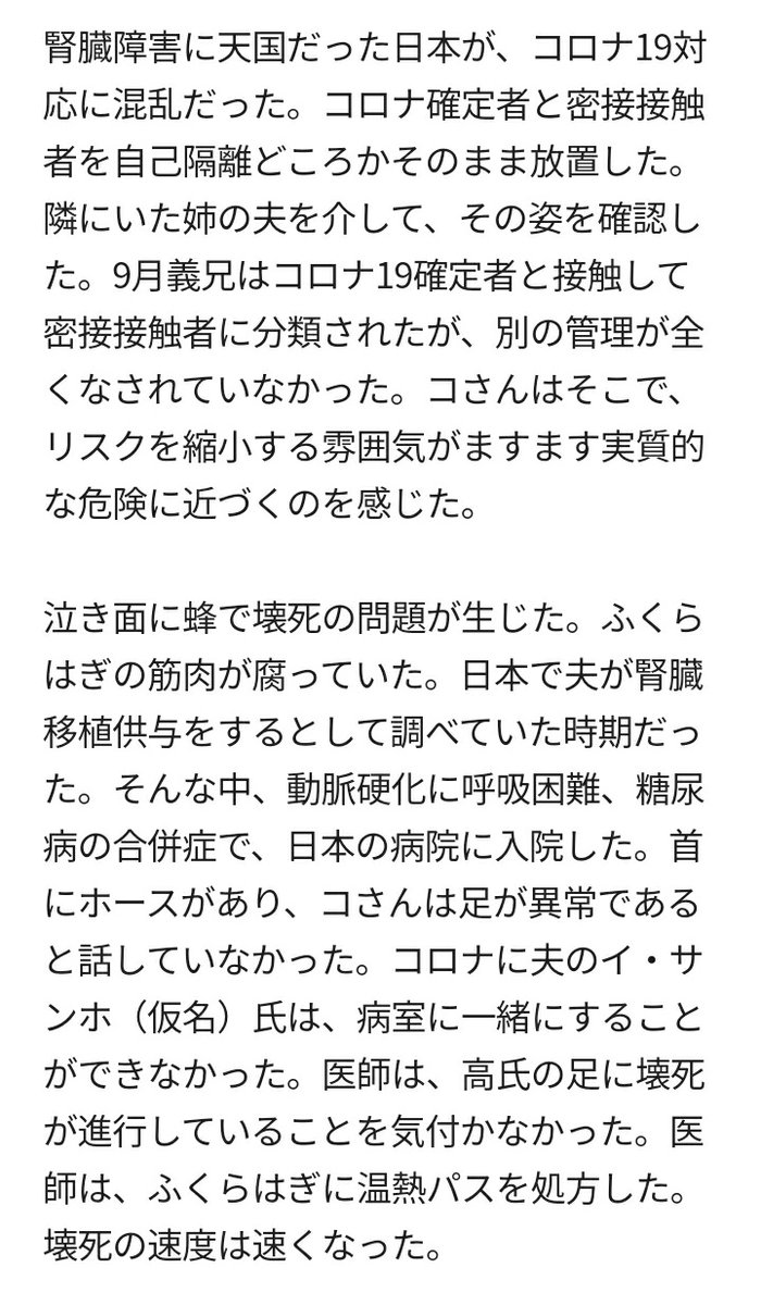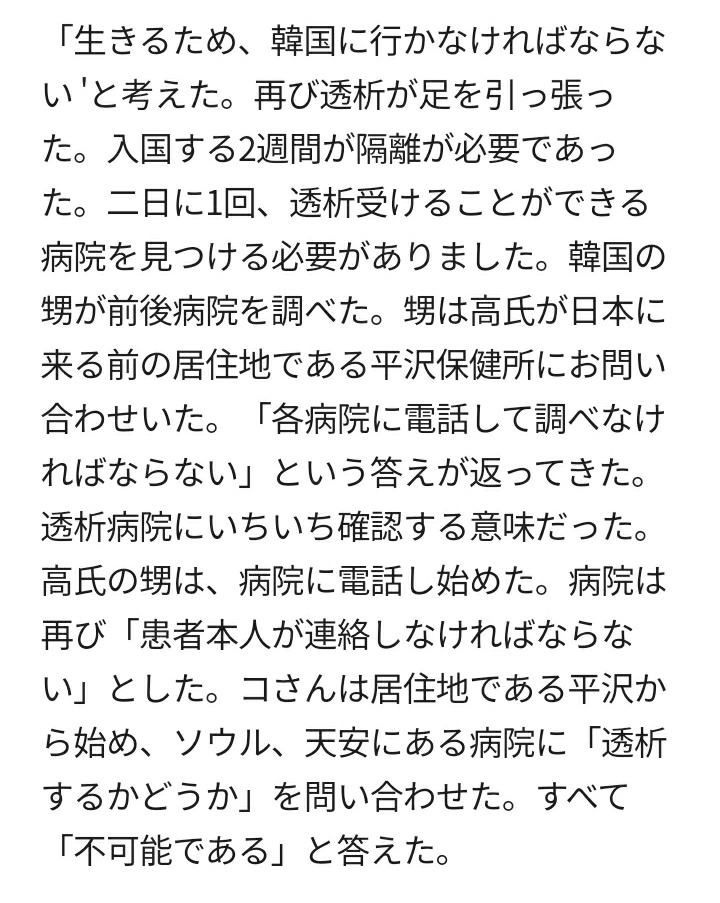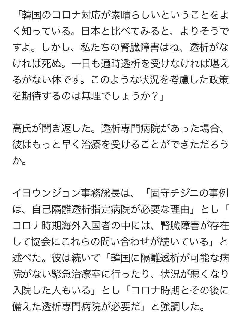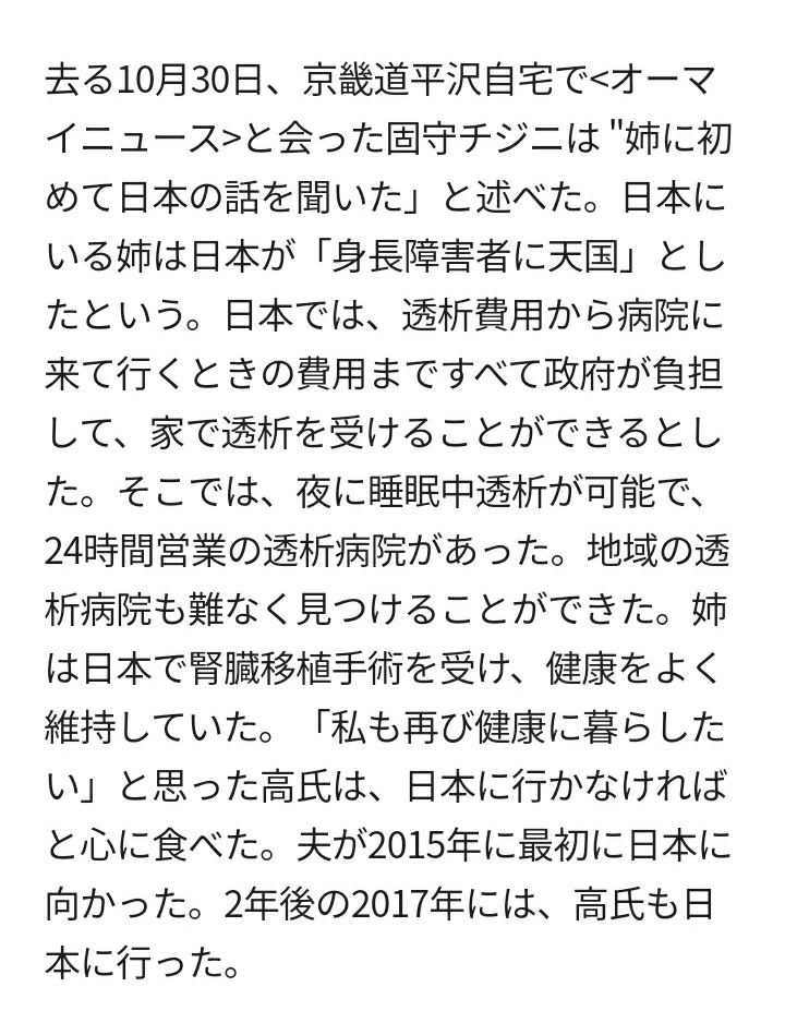 韓国人女性が、日本政府の透析費負担制度を目当てに来日。2017年からコロナの影響で帰国する今年まで約3年間、日本の医療制度を利用して透析を受けた。日本に住む姉が「日本は腎臓障害者の天国」と勧めたという。