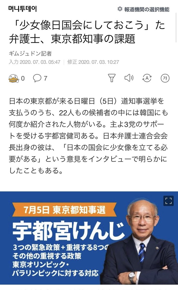 韓国メディアが宇都宮けんじ氏の東京オリンピック中止署名を大々的に報道、宣伝しています。