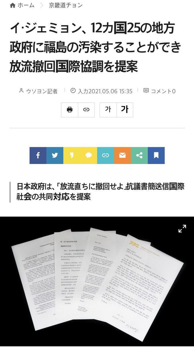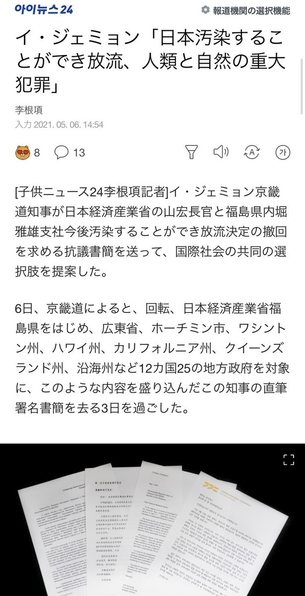 「日本は敵性国家」発言のイ・ジェミョン京畿道知事が、福島県と経済産業省及び梶山経産大臣に「福島の処理水放出は犯罪行為」と書簡を送り「直ちに撤回せよ」と要求した。