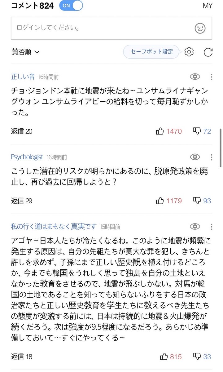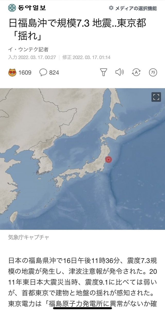 次期大統領のユン・ソギョル氏が選挙中に「福島原発で放射能流出は無かった」と発言したため、昨日の地震で原発が心配されるとユン氏を揶揄するコメントも多い。