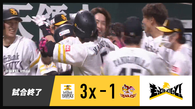 【試合終了】延長10回、周東選手の2ランホームランでサヨナラ!先発・大関投手は終始安定した投球で8回無失点の好投!4回には柳田選手のソロホームランで飛び出し先制するも9回に同点になりますが、見事延長戦を制しパ・リーグ首位となりました!