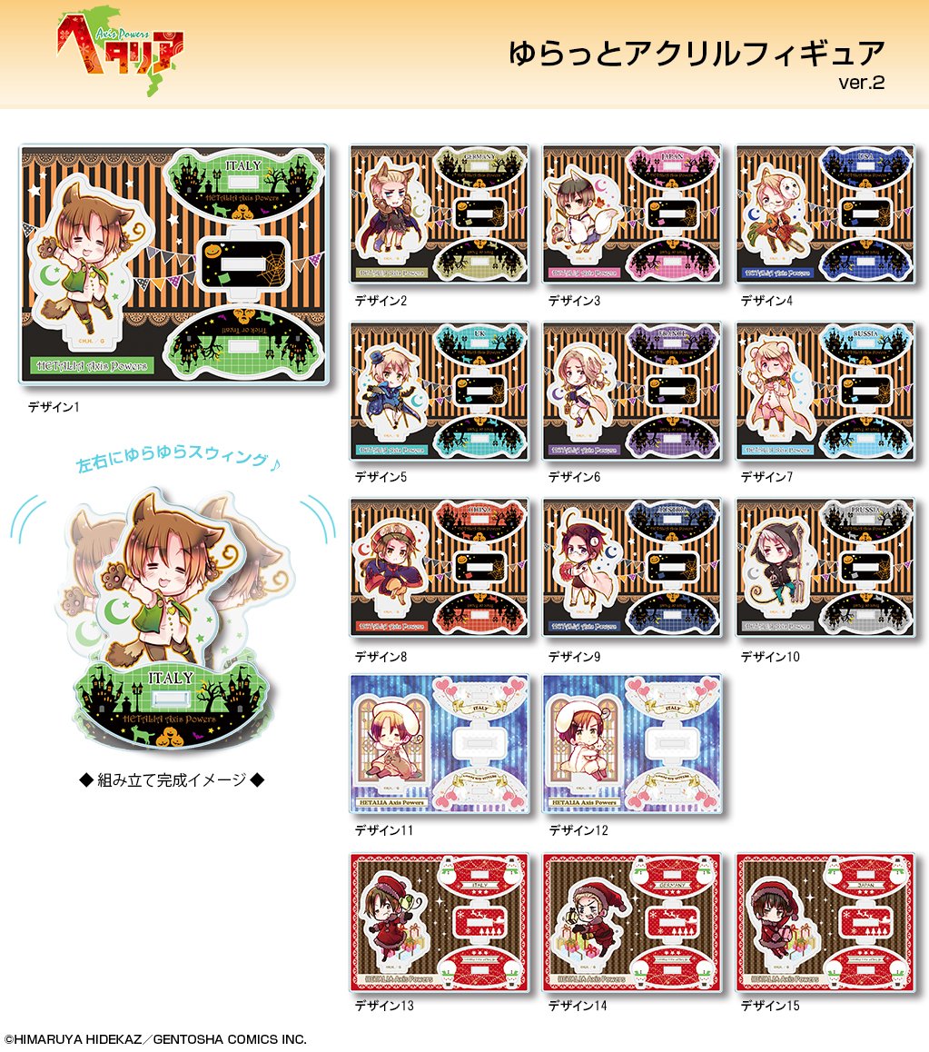 「ヘタリア Axis Powers」より、【ゆらっとアクリルフィギュア】御好評につき第2弾登場♪組み立てると左右にスウィングする可愛いアクリルフィギュアです。全15種類☆ dezaegg.com/products/list.…