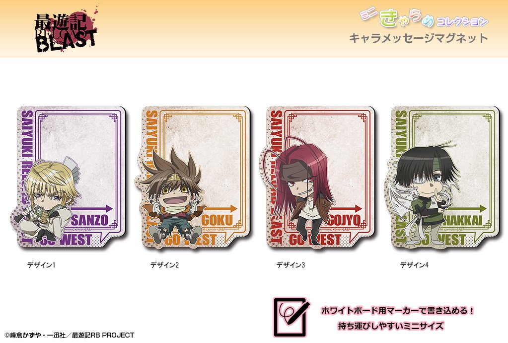 TVアニメ「最遊記RELOAD BLAST」より、"ミニきゃらめコレクション"登場!裏面はマグネット仕様です。書いたり&消したりできるミニサイズのお役立ち品!お好きな場所に貼って、メモ書き等にお使い頂けます♪ #最遊記RB dezaegg.com/products/list.…
