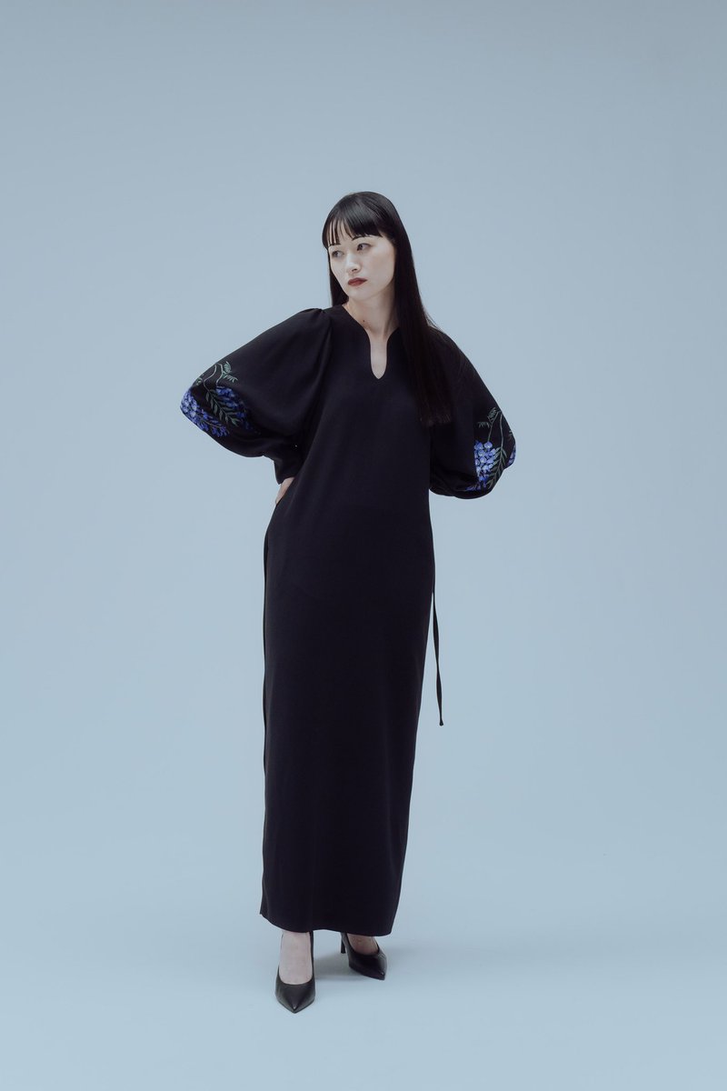 日本舞踊のような佇まいのブラックドレスです