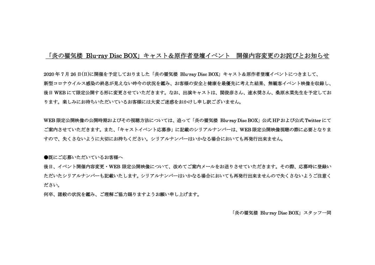 新型コロナウイルスの感染拡大の影響を受け、7月26日(日)に予定しておりました「炎の蜃気楼Blu-ray Disc BOX」発売記念イベントの開催内容を変更させて頂きます。