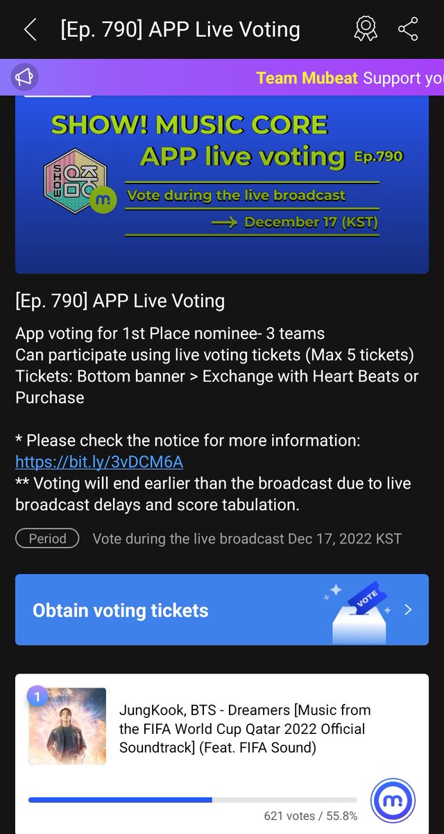 Dreamers by Jungkook is nominated in APP Live voting for Music Core on Mubeat. Drop your votes, one account can use maximum 5 voting tickets in one app live voting.