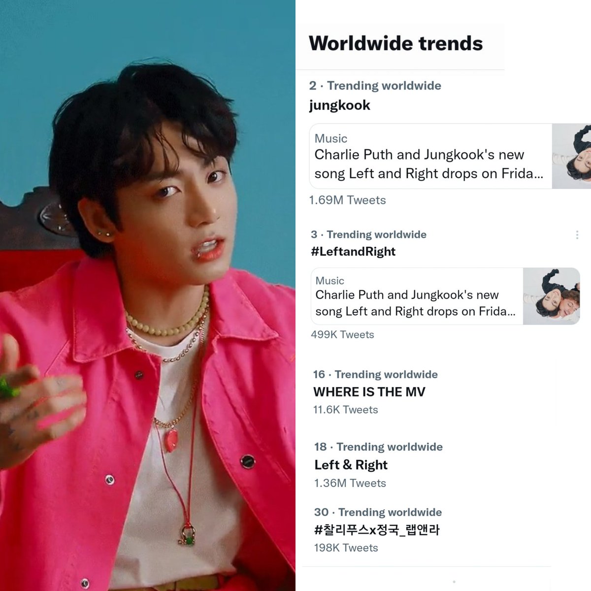 TRENDS | #LeftAndRight is now trending Worldwide at #8 after MV Teaser. 'JUNGKOOK IN PINK' and 'JUNGKOOK LOOKS SO GOOD' are also trending in many countries.