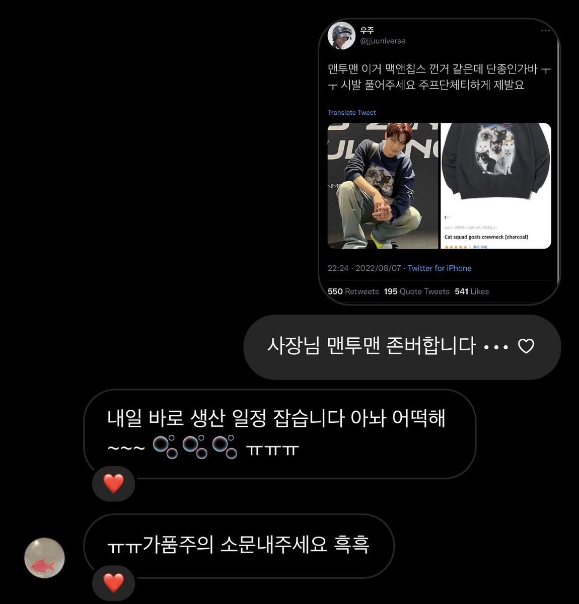 그리고 어떤 천사분이 맥앤칩스에 주연이 맨투맨 문의 해주셨는데 사장님께서 바아로 생산 일정 잡는다고 하신대욯!!!!!!!!!!!!!!!!!!!