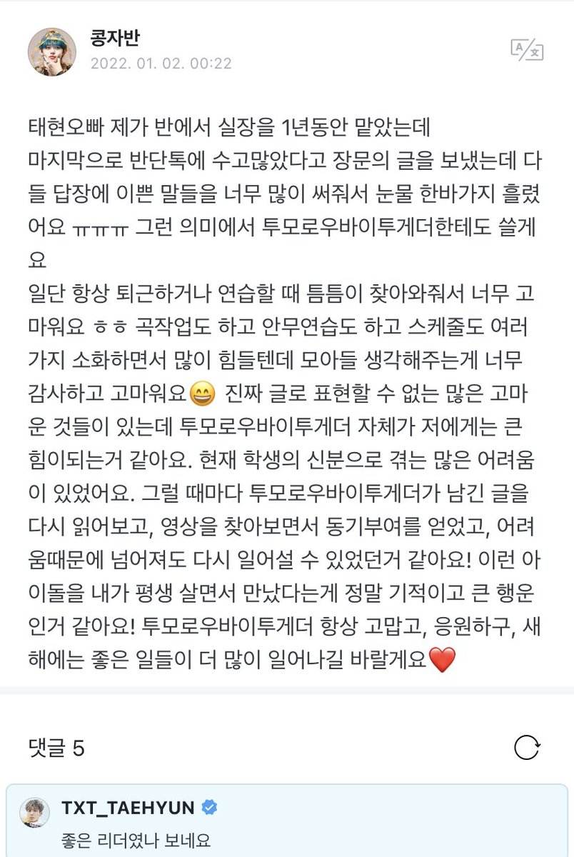 👤: taehyun i was class leader for a year, to end to the year i sent a long message saying they’ve worked hard to the class group chat and they all replied with such nice messages i cried a river ㅠㅠㅠ