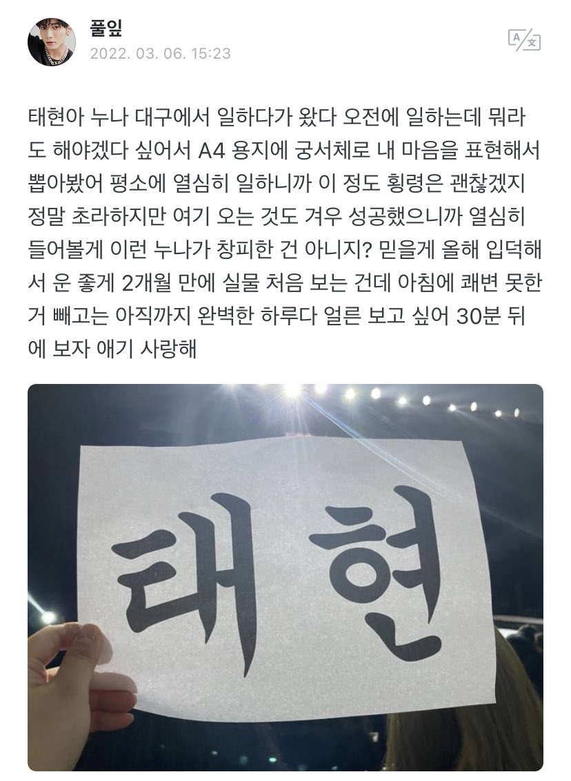 👤: taehyun i came from working at daegu i was working up until the morning and thought i should at least bring something so i printed out your name on A4 paper. see you in 30 minutes baby i love you