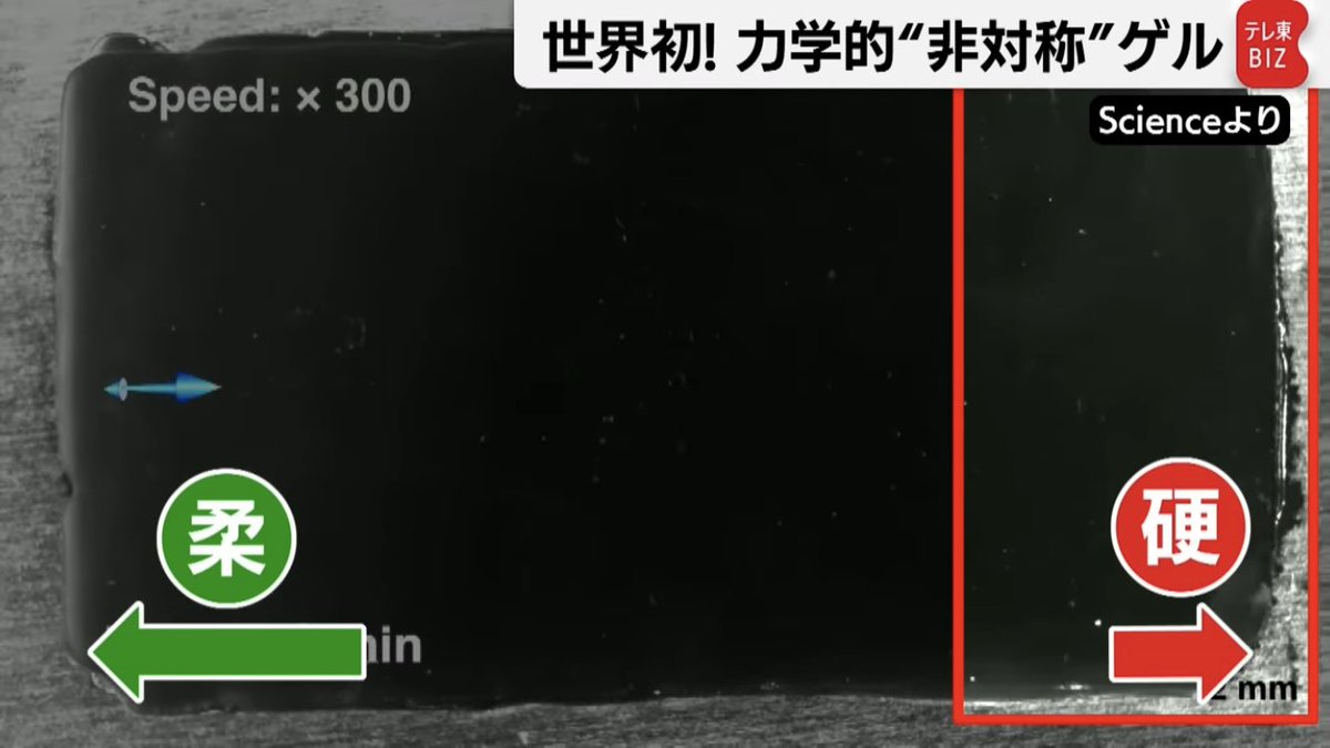 しかし、今回開発されたゲルは左側だけに変形し、右側にはほぼ変形しない(力学的に非対称)。