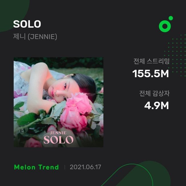 [INFO] 210617 SOLO by Jennie is currently the second on the list for solo debut songs (male & female) with most unique listeners on MelOn at 4.9 million.
