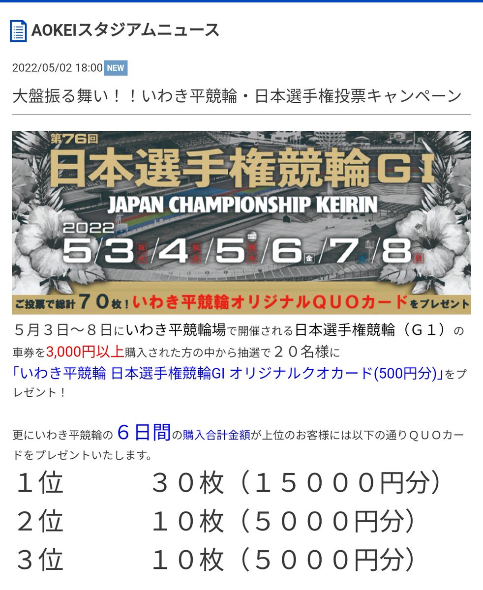✨7/10~12 #いわき平競輪 にて開催のSNF・G2オリジナル #QUOカード を抽選で【 10名様 】に #プレゼント✨