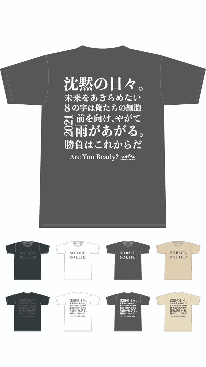 近日販売予定の2021年版「NO RACE, NO LIFE!」Tシャツのデザインをどうぞ。
