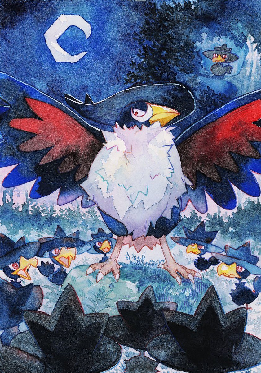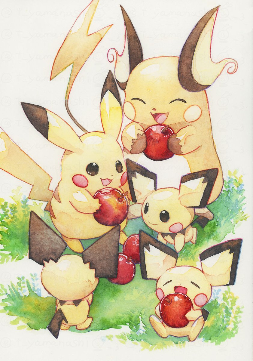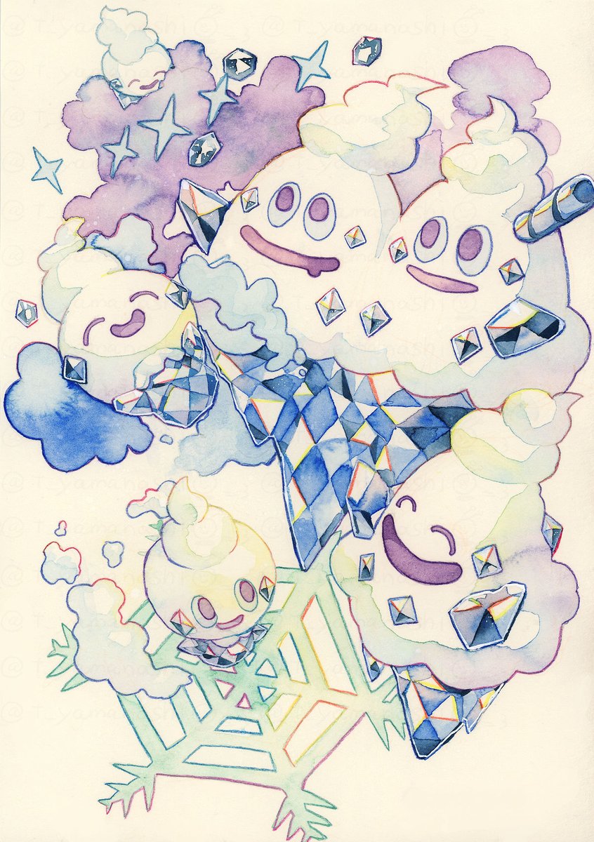 最近透明水彩で描いたイラストたちです バイバニラ一家、ピカチュウ一家、ドンカラス一家、ゴース一家