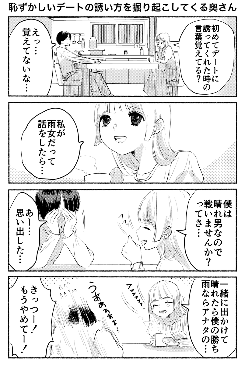 4コマ「恥ずかしいデートの誘い方を掘り起こしてくる奥さん」