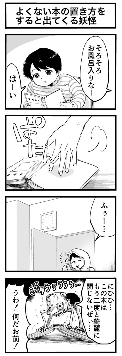 4コマ「よくない本の置き方をすると出てくる妖怪」