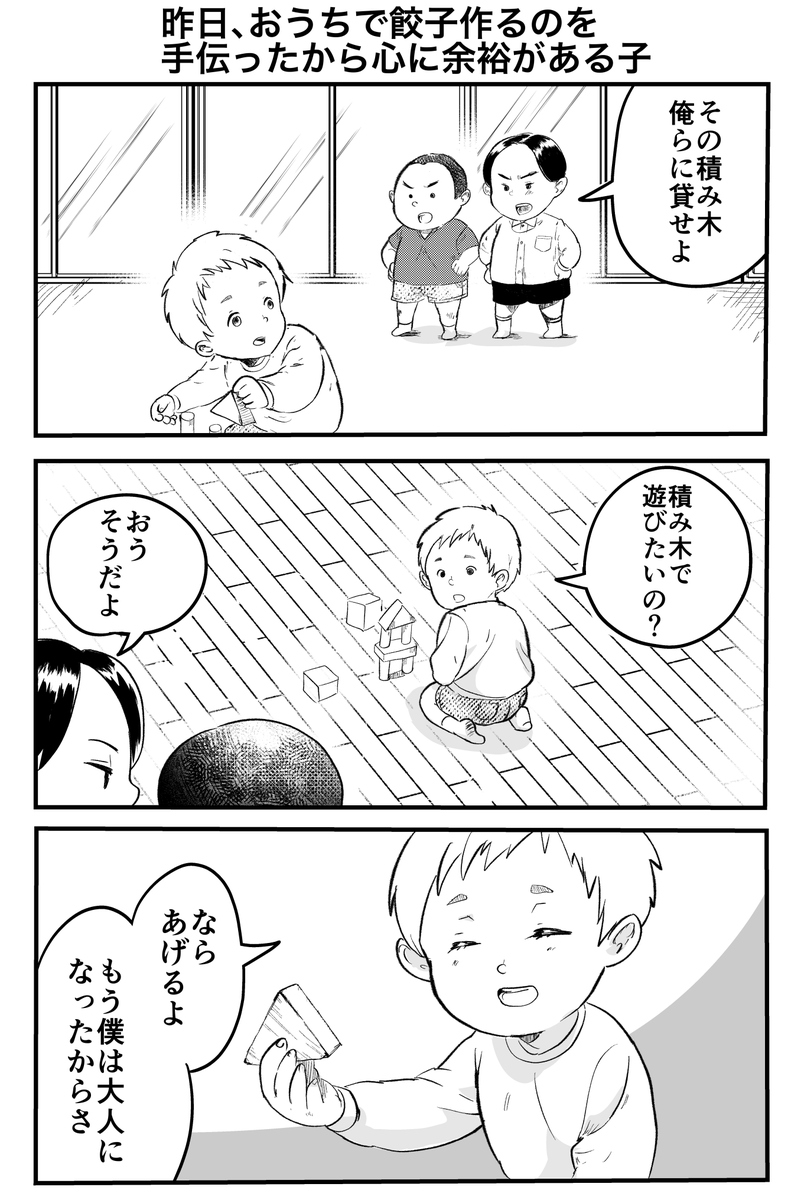 3コマ「昨日、おうちで餃子作るのを手伝ったから心に余裕がある子」