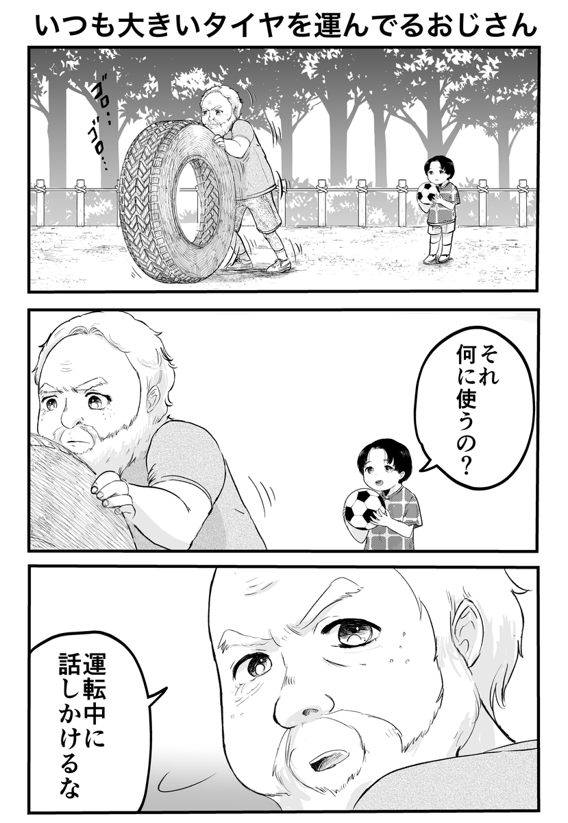 3コマ「いつも大きいタイヤを運んでるおじさん」
