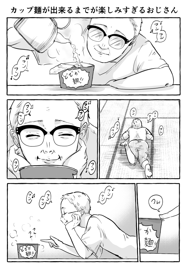 1ページ漫画「カップ麺が出来るまでが楽しみすぎるおじさん」(再掲)