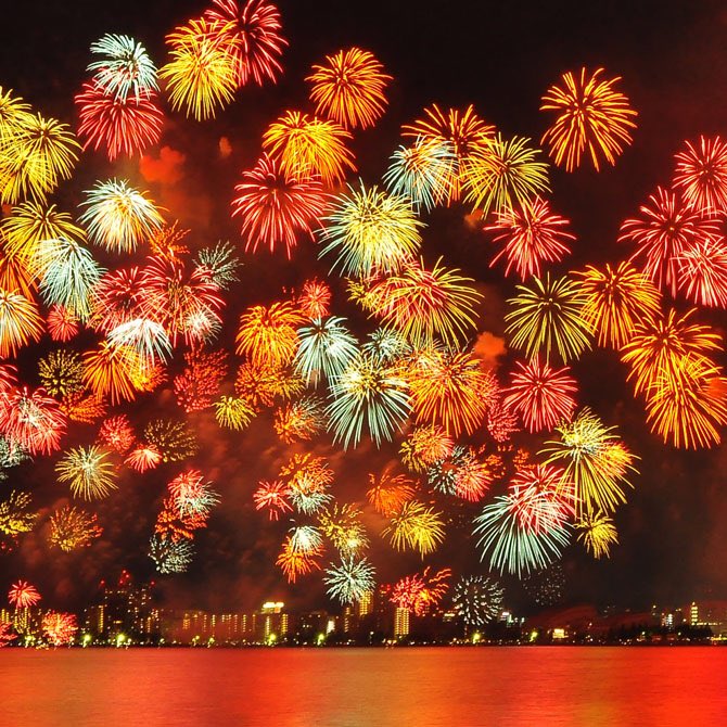 約1万発の花火が湖面と上空を彩る様子は圧巻!