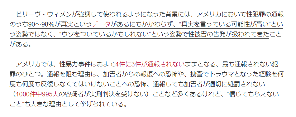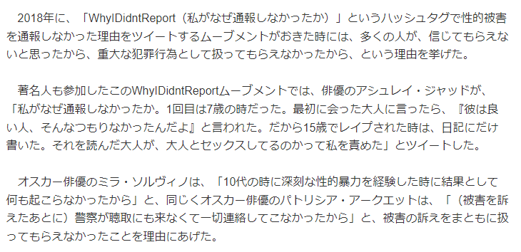 米国では性犯罪の通報のうち90〜98%が真実というデータがあるにもかかわらず“ウソをついているかもしれない”という姿勢で被害が扱われてきた背景から、まずは訴えを真剣に受け止めて捜査すべきとされている。front-row.jp/_ct/17397240
