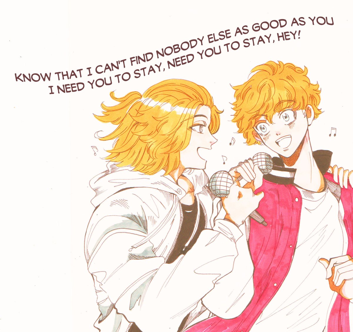 Here is my small contribution! I imagined them singing this song together in a karaoke.