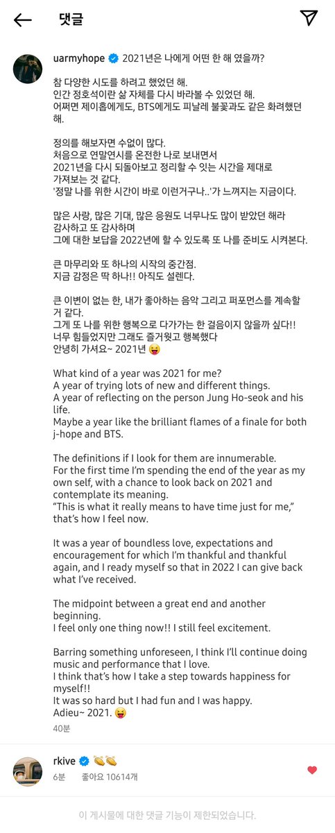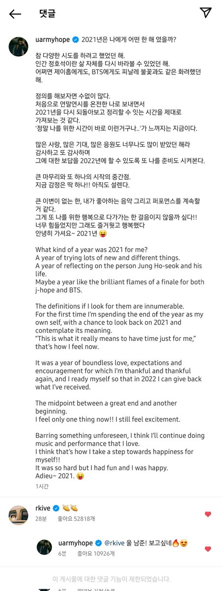 211231 j-hope Instagram comment