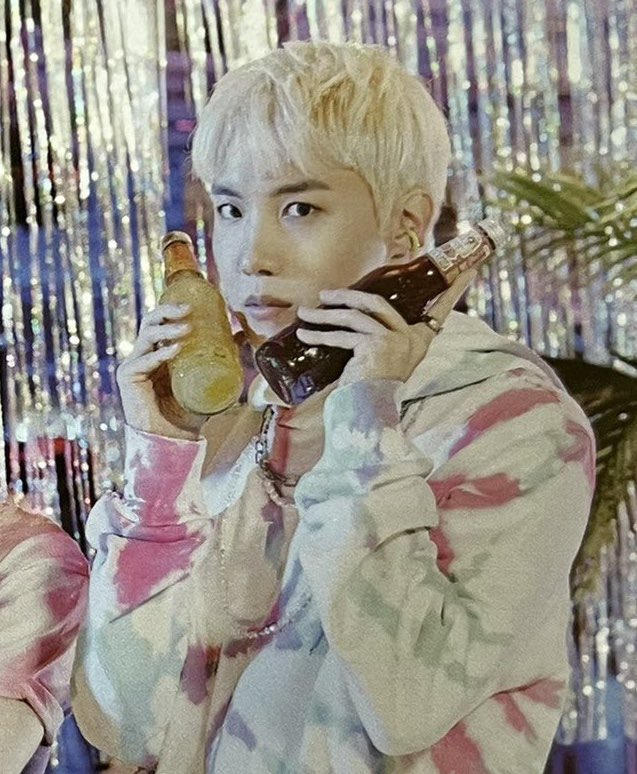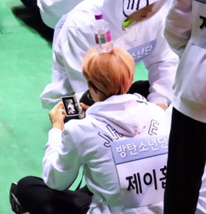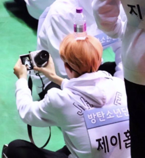 hobi taking a photo of himself with a bottle of water on top of his head 🥺