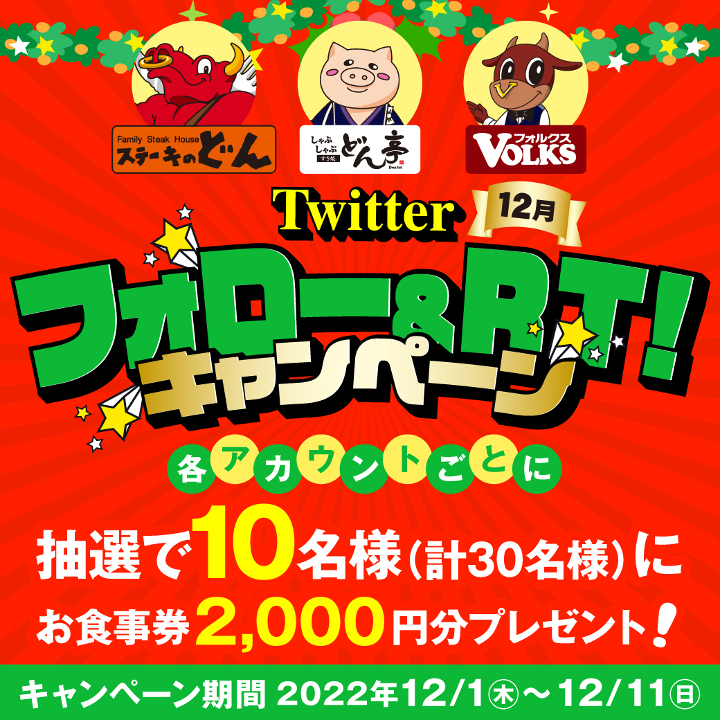 このアカウントのフォロー&この投稿のRTでフォルクスやステーキのどん、しゃぶしゃぶどん亭で使えるお食事券3,000円分が抽選で当たる(/・ω・)/