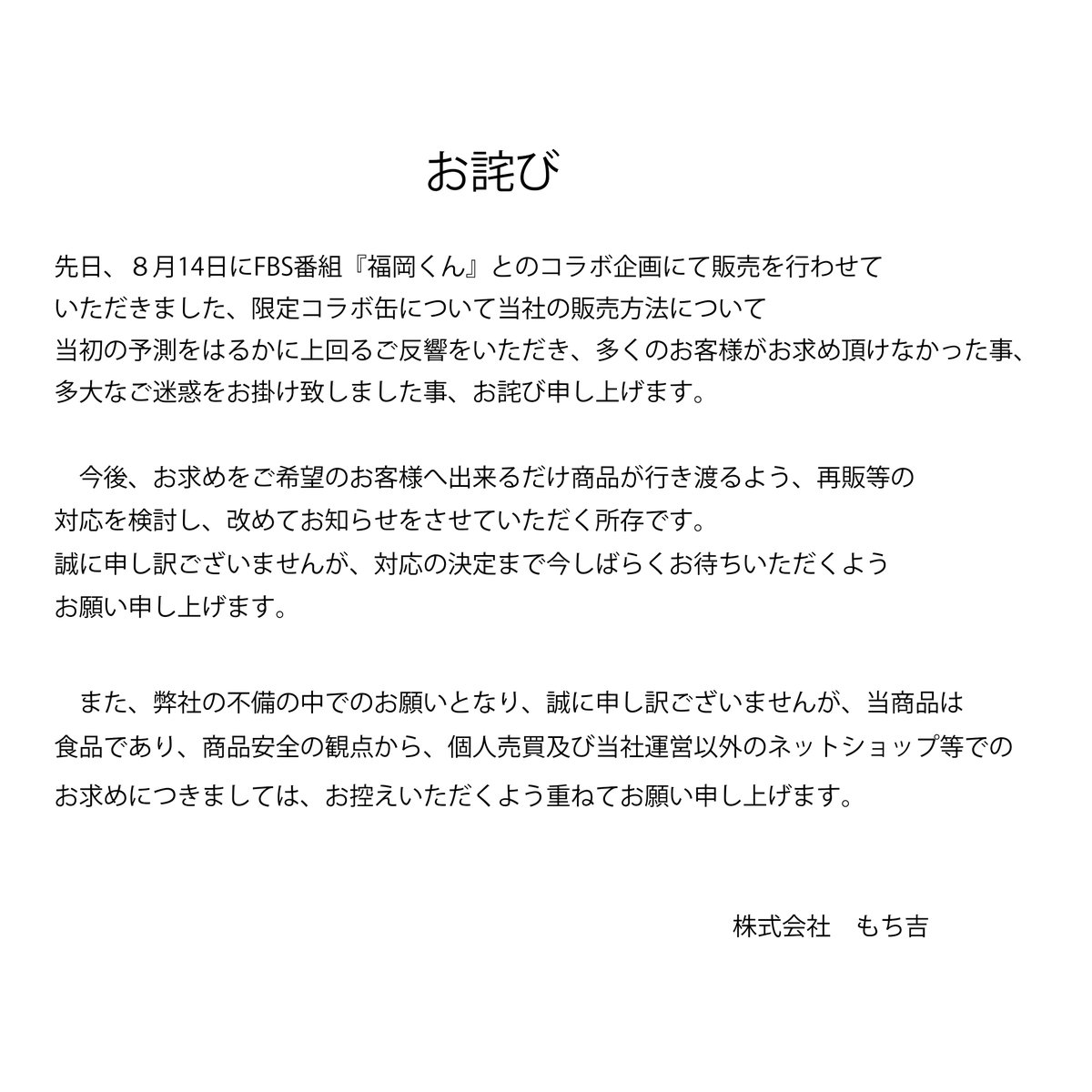 8月14日放送のFBS番組「福岡くん」とのコラボ企画にて販売を行った限定コラボ缶についてお詫びとお願い twitter.com/Fukuoka_kun/st…