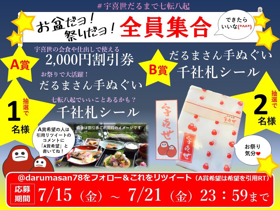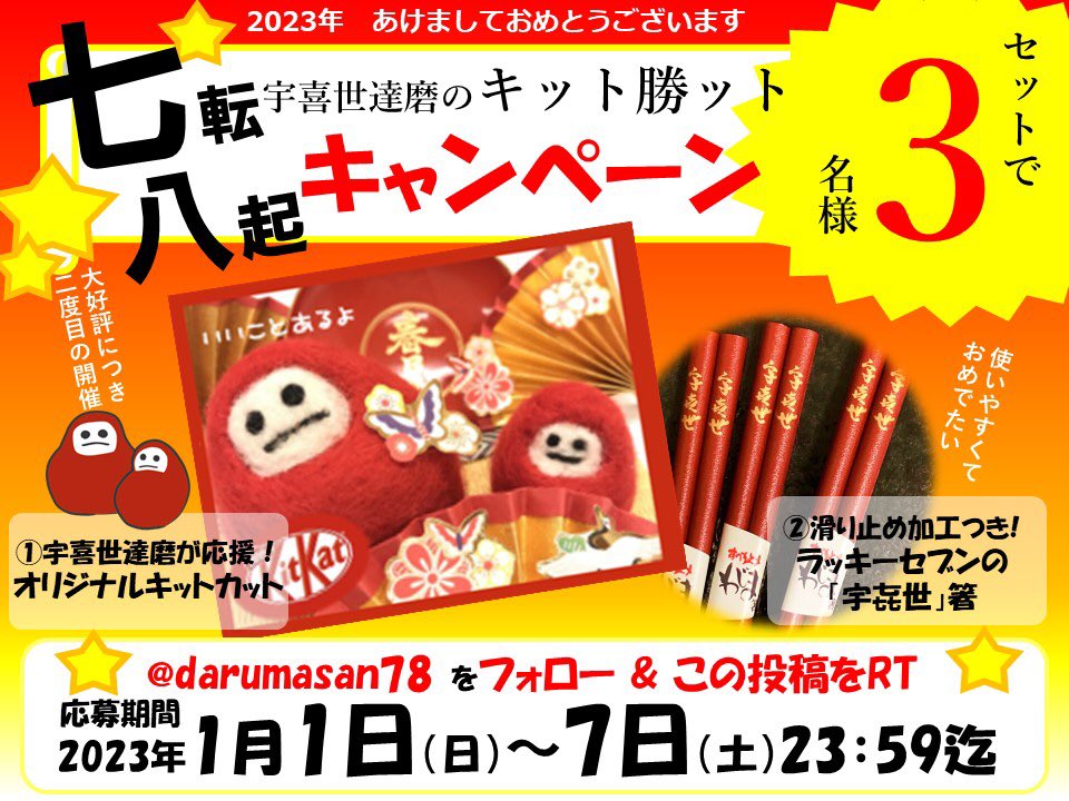 転んでも可愛く起き上がってくる宇喜世だるまのパワーが届きますように‼️ご応募方法は当アカフォロー&投稿RT、詳細はリプ欄ご覧下さい💪