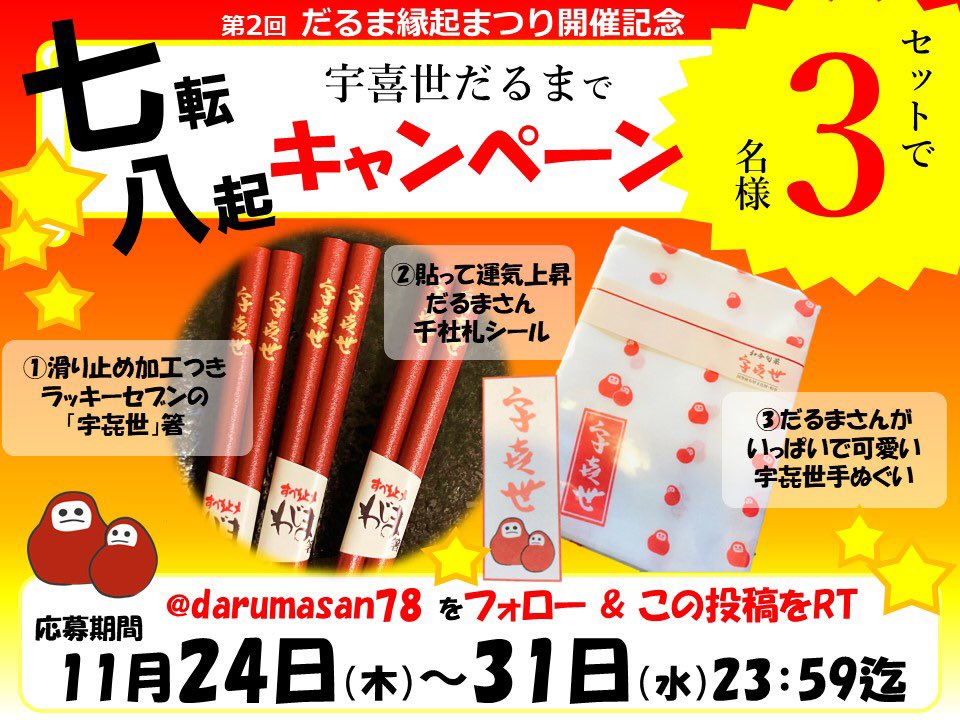 #だるま縁起まつり 開催を記念して縁起がいい手拭いとお箸、千社札シールをセットで3名様に差し上げます‼️七が3つのラッキーセブン&七転八起でいいことありますように❗️