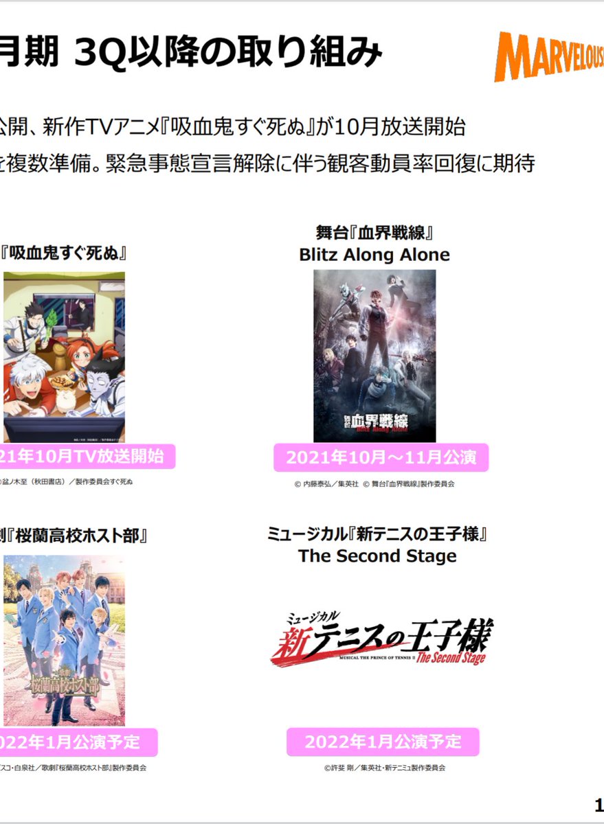 本日公開のマーベラス決算説明資料、13Pの音楽映像事業2022年3月期3Q以降の取り組みに「ミュージカル『新テニスの王子様』