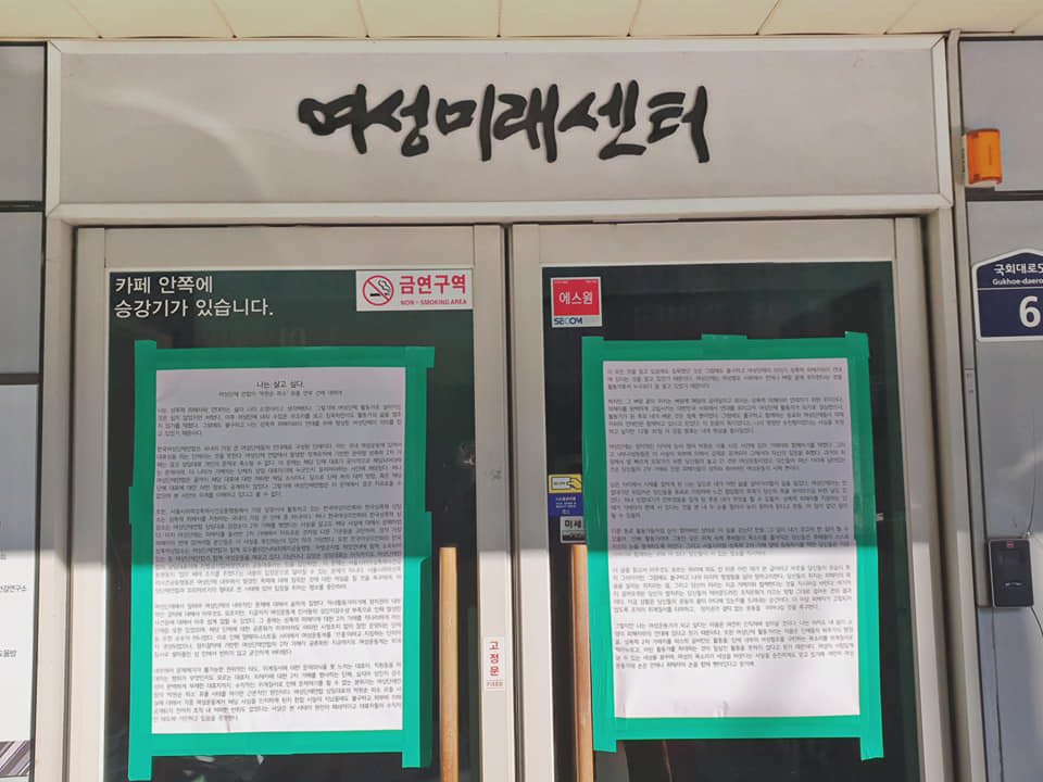 김지연씨는 한국여성단체연합 사무실 앞에 붙인 대자보를 통해 "수직적인 위계질서로 인해 문제제기를 할 수 없는 분위기는 '박원순 피소' 유출 사태를 야기한 근본 원인"이라고 썼다.