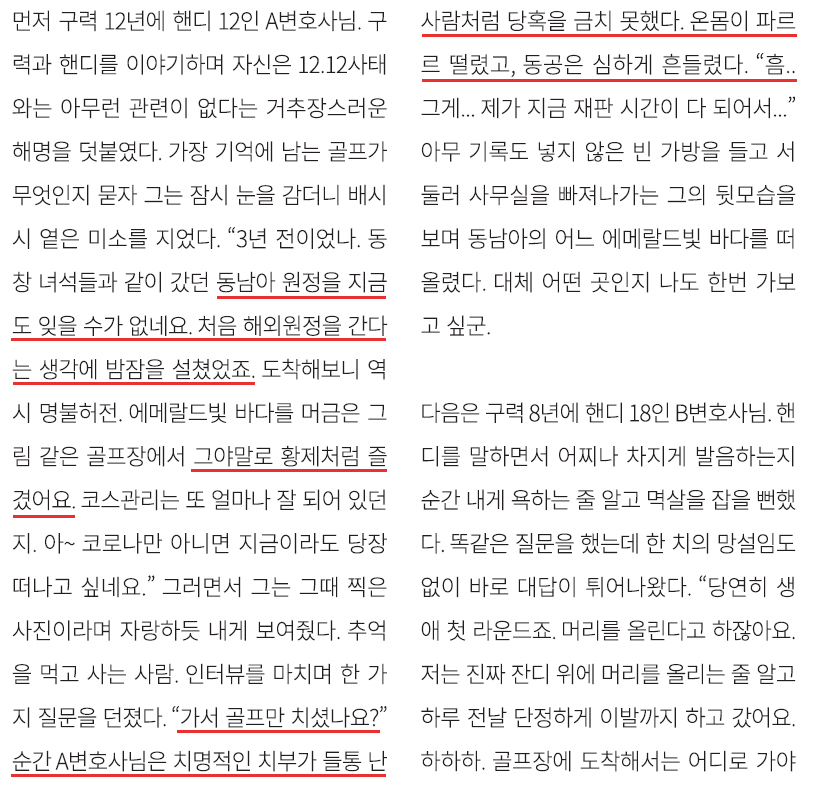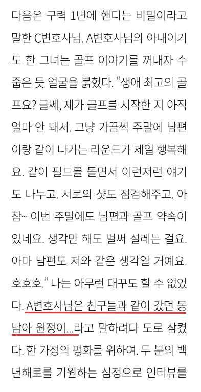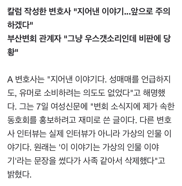 부산 A변호사는 변호사회 소식지에 '동남아 원정'을 유머 소재 삼아 골프 칼럼을 썼다. "불법 성매매를 유머로 소비" "여성 희화화" 비판을 받자, "가상의 인물 이야기"라고 해명했다.