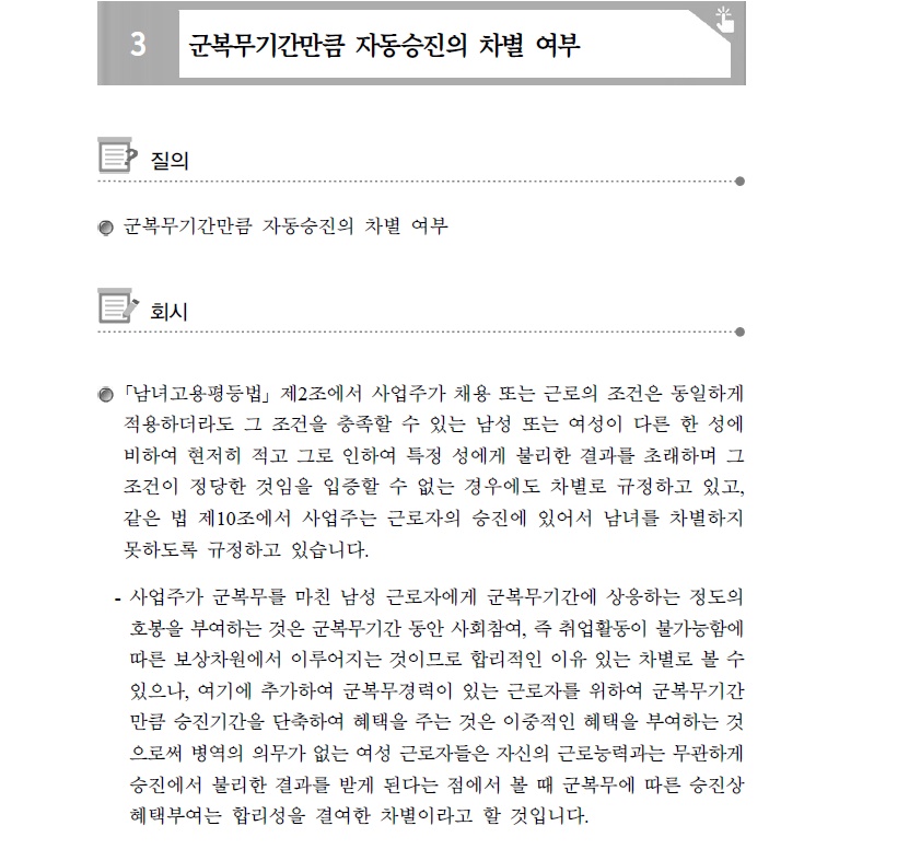 이미 호봉에서 군 복무기간을 인정하는 상황에서 승진심사 때도 군 복무기간을 반영하는 것은 이중 혜택이라는 고용노동부 행정해석에 따른 것이다.