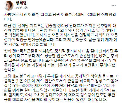 [전문] 장혜영 의원 "믿었던 대표의 성추행 충격...누구나 피해자 될 수 있어"