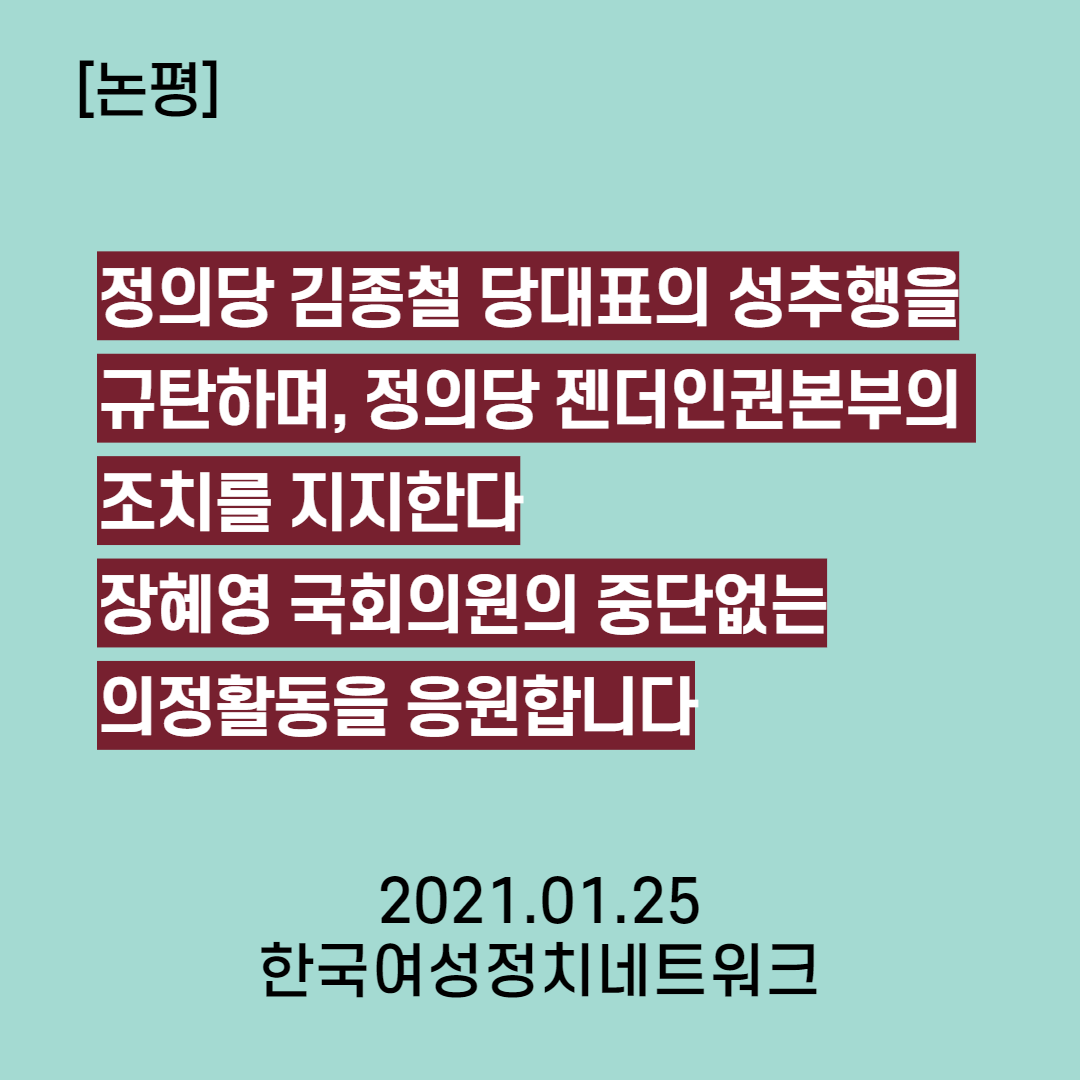 한국여성정치네트워크는 논평을 통해 김종철 정의당 대표의성추행을 규탄하며 장혜영 의원이 중단 없이 의정활동을 해야 한다며 연대와 응원을 보냈다.