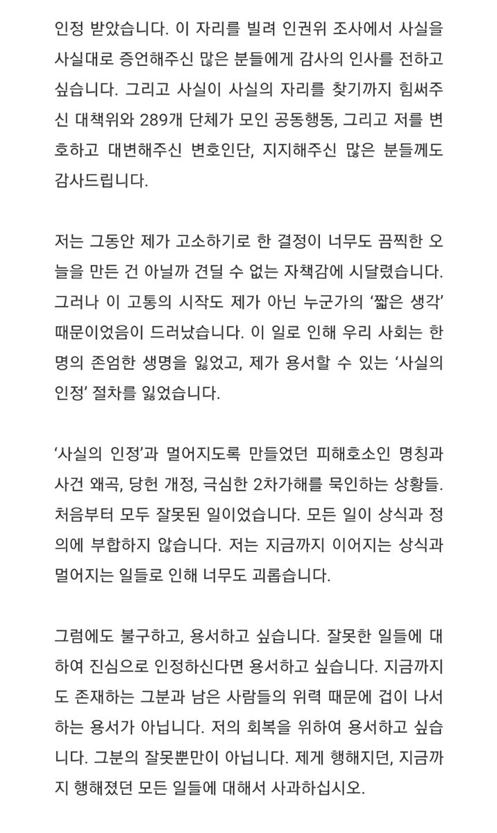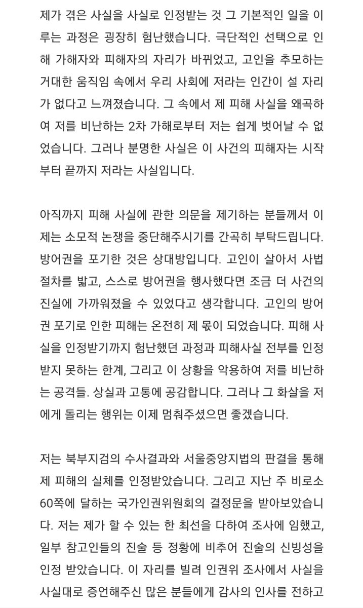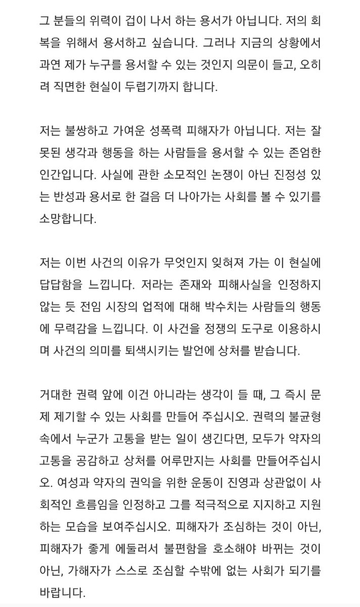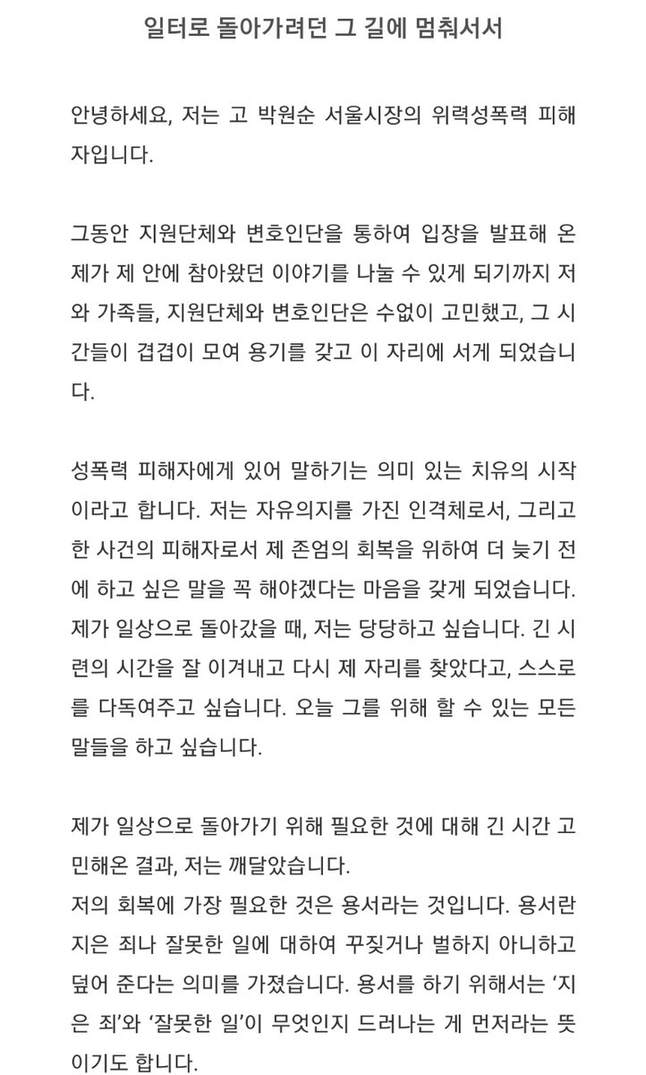 박원순 전 서울시장 성폭력 사건 피해자 말 전문.