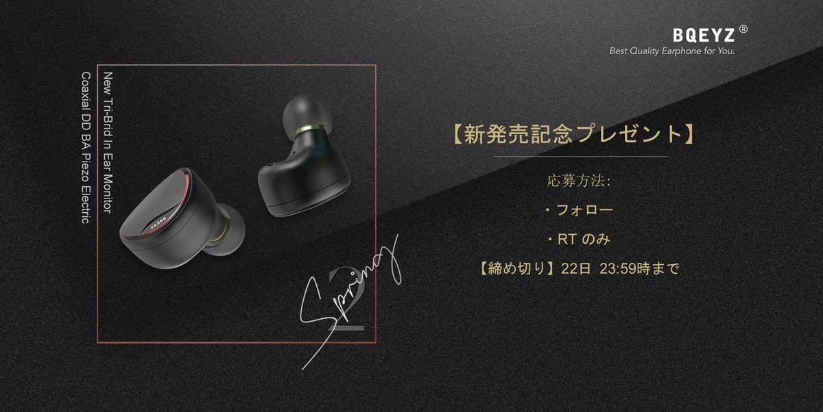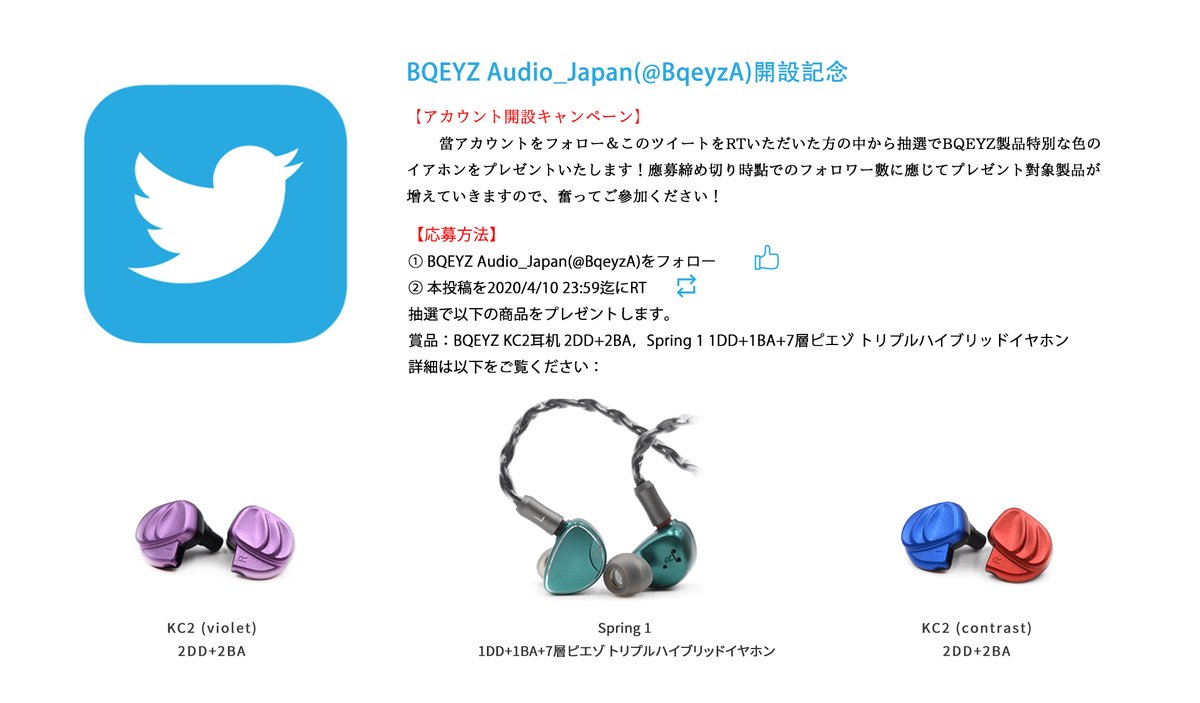 【アカウント開設キャンペーン】当アカウントをフォロー&このツイートをRTいただいた方の中から抽選でBQEYZ製品特別な色のイアホンをプレゼントいたします!応募締め切り時点でのフォロワー数に応じてプレゼント対象製品が増えていきますので、奮ってご参加ください!