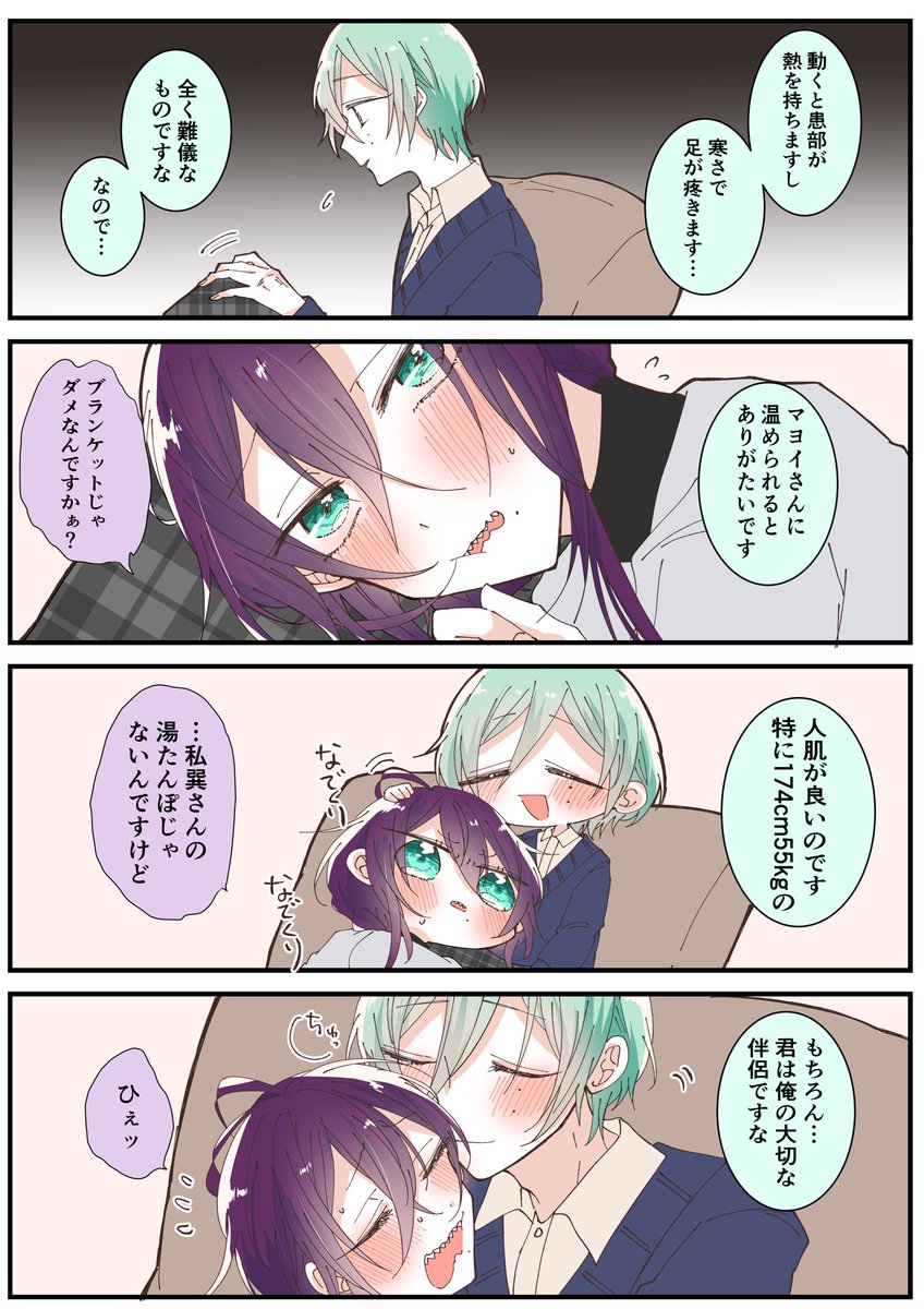 冬の撮影休憩中の巽マヨはだいたいいつもこんな感じ。巽の手は暖かく、マヨイの手は冷たいので夏は逆の現象が起きる。