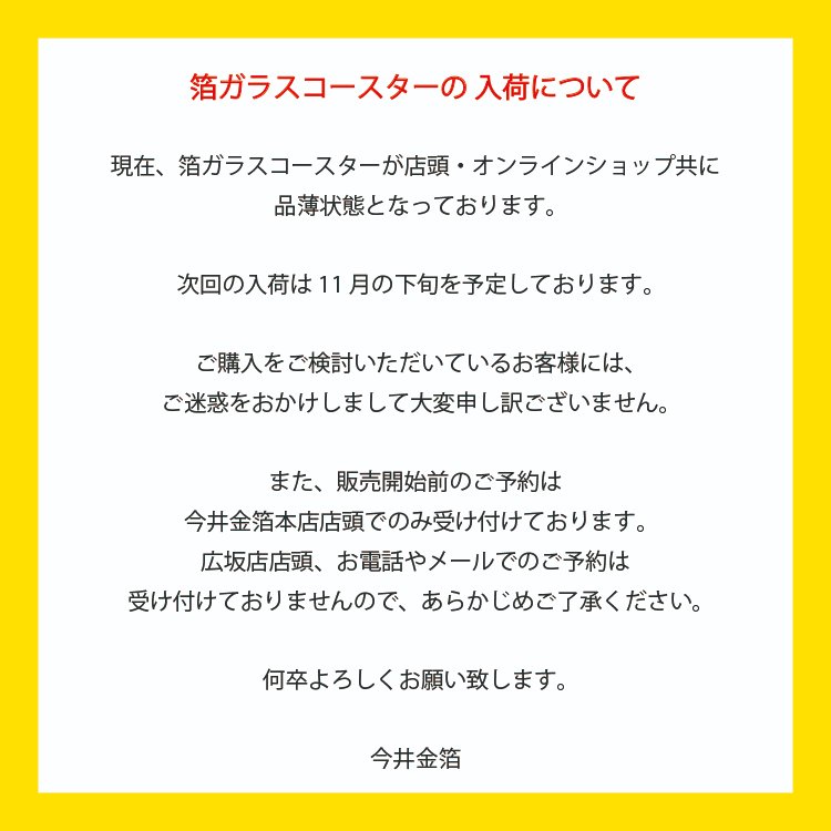 現在、箔ガラスコースターが品薄となっております🙇♂️🙇🙇♀️ 次回入荷日が決まりましたらお知らせ致します!