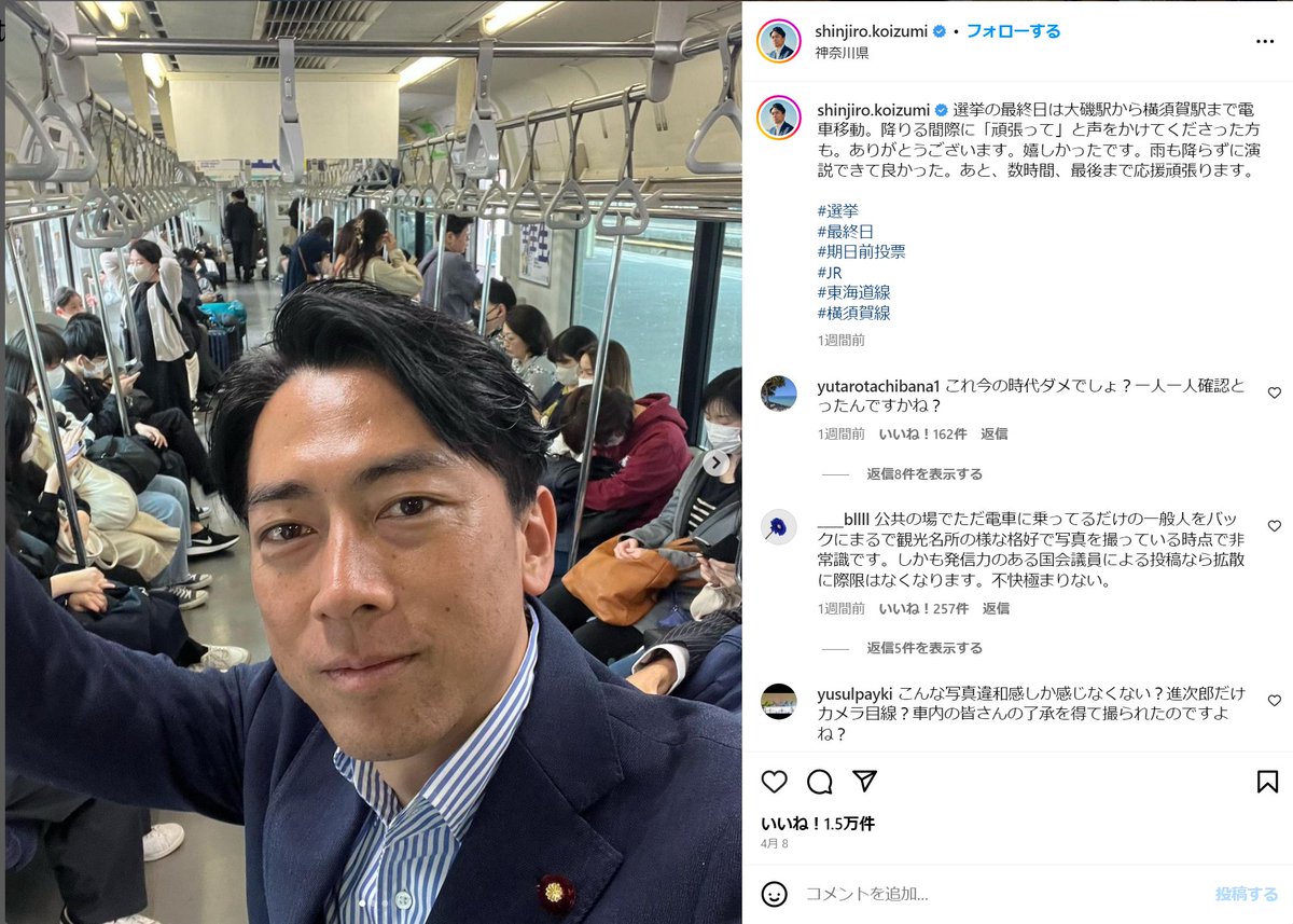 小泉進次郎、電車の中での自撮りショットに批判殺到「これ今の時代ダメでしょ」「車内の人達が写ってる」